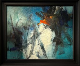 Sa peinture à l’huile sur toile “T1963-U27“ nous offre un autre regard sur sa technique. Le fond noir profond sert de base à une superposition de strates colorées, où l’artiste joue avec des nuances de bleu et d’ocre, renforcées par sa technique du grattage. Ce procédé, qui consiste à retirer certaines couches de peinture pour révéler les sous-couches, accentue les contrastes et apporte une dimension tactile à l’œuvre. Le dynamisme du trait y est prégnant, chaque ligne capturant un instant de tension et d’énergie brute. Son approche diffère de celle de Miotte par une préparation méthodique du geste, rendant chaque mouvement calculé et impactant.